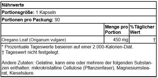 | Beschreibung | Die meisten von uns denken, Oregano sei ein kulinarisches Kraut, das zum Würzen unserer italienischen Lieblingsgerichte verwendet wird. Kräuterexperten werden Ihnen jedoch mitteilen, dass Oregano reich an flüchtigen Ölen und nützlichen Flavonoiden ist, die es zu einem hervorragenden Stärkungsmittel für die Erhaltung der allgemeinen Gesundheit und Vitalität machen. Swanson´s praktischen Kapseln machen es einfacher als je zuvor, die zahlreichen gesundheitlichen Vorteile von Oregano zu nutzen. |