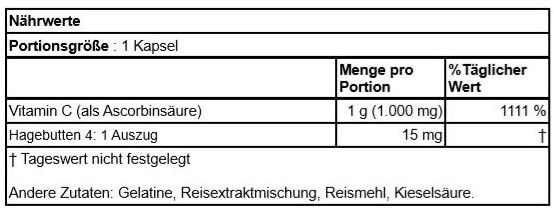 | Beschreibung | Eine hochwirksame Vitamin C-Quelle mit Hagebutten! Hagebutten haben Bioflavonoide, die die Absorption des Vitamins fördern und die antioxidative Wirkung erhöht. Jede Kapsel enthält 1.000 mg Vitamin C mit 15 mg Hagebuttenextrakt. |