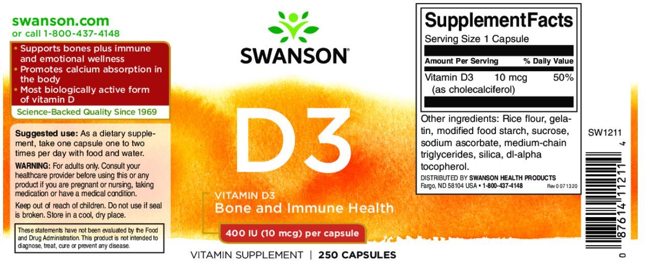 Fördern Sie die Knochengesundheit mit Swanson Vitamin D3! Vitamin D, oft als Sonnenvitamin bezeichnet, unterstützt auch das Immunsystem und die emotionale Gesundheit. Forscher und Gesundheitsexperten auf der ganzen Welt erkennen die Bedeutung eines angemessenen Vitamin-D-Spiegels im Körper, und Sie können das auch! Jede Kapsel liefert 400 IE Vitamin D. |