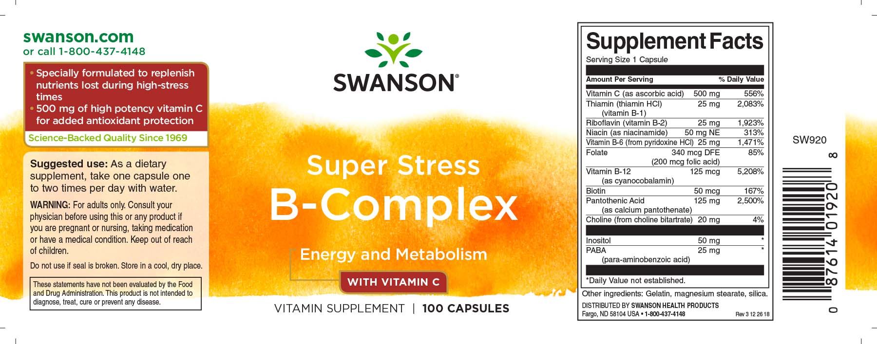 | Beschreibung | Swanson Super Stress B Complex ist ein einzigartiger Komplex, der speziell entwickelt wurde, um die Nährstoffe aufzufüllen, die in Zeiten mit hohem Stress am meisten benötigt werden. Jede Kapsel kombiniert eine großzügige Versorgung mit B-Komplex-Vitaminen mit dem starken antioxidativen Schutz von hochwirksamem Vitamin C. |