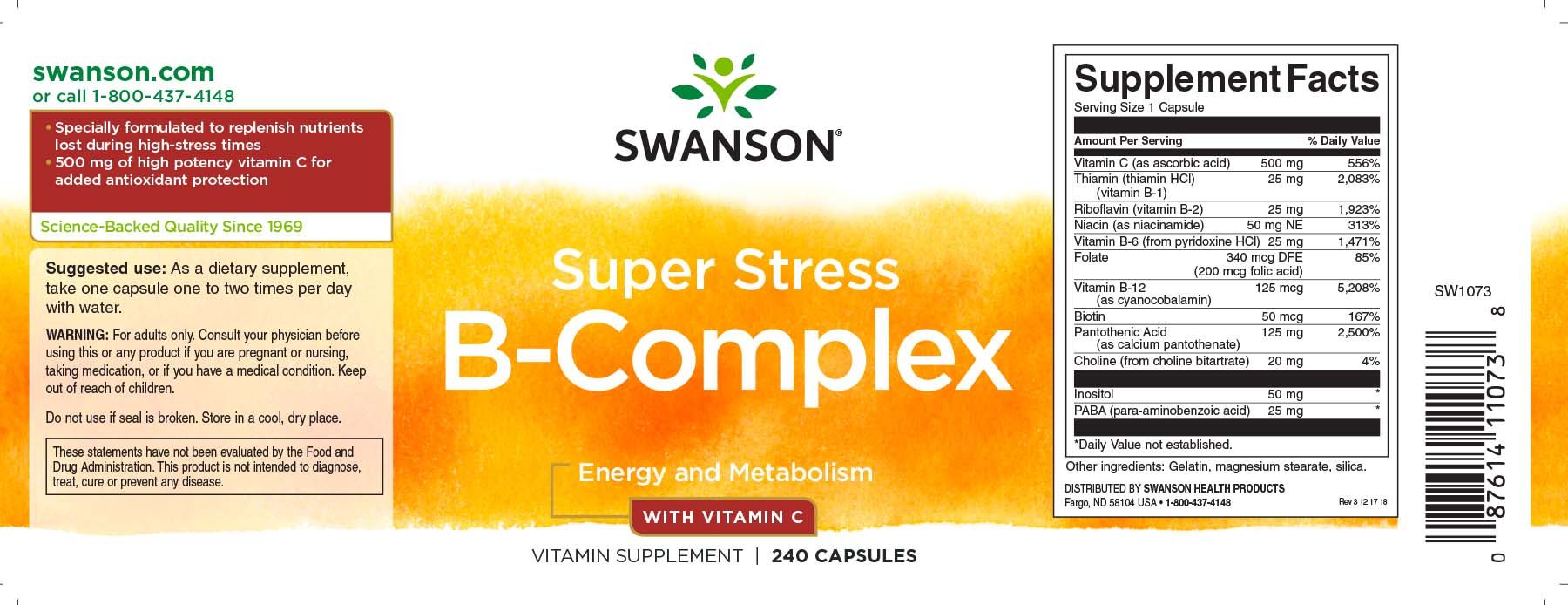 | Beschreibung | Swanson Super Stress B Complex ist ein einzigartiger Komplex, der speziell entwickelt wurde, um die Nährstoffe aufzufüllen, die in Zeiten mit hohem Stress am meisten benötigt werden. Jede Kapsel kombiniert eine großzügige Versorgung mit B-Komplex-Vitaminen mit dem starken antioxidativen Schutz von hochwirksamem Vitamin C. |