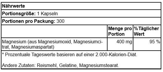 | Beschreibung | Mit Swanson Triple Magnesium Complex erhalten Sie einen ganzen Tag lang die Versorgung mit dem essentiellen Mineral Magnesium! Diese einzigartige Formel enthält drei verschiedene Magnesiumquellen, um eine optimale Bioverfügbarkeit zu fördern. Magnesium ist für starke Muskeln und Knochen, Herz-Kreislauf-Gesundheit und die Funktion des Nervensystems notwendig. Jede Kapsel liefert 400 mg Magnesium und damit bekommen Sie eine komplette Tagesdosis in nur 1 Kapsel. |