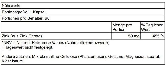 | Verwendung | Nehmen Sie eine Kapsel pro Tag mit Nahrung und Wasser ein. Die Einnahme von Zink auf nüchternen Magen kann bei manchen Menschen zu Magenverstimmung führen. |