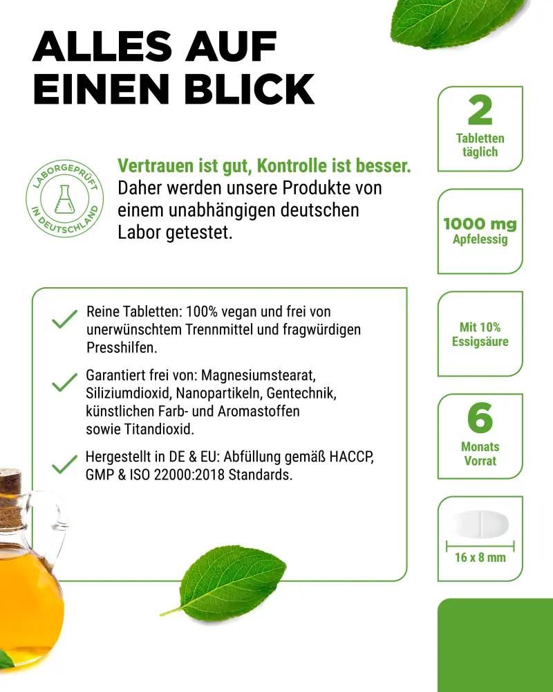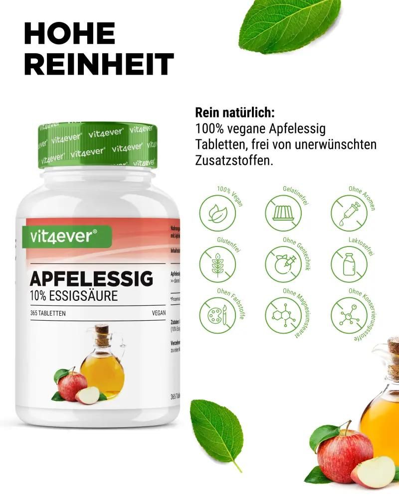 Die natürliche Kraft des Apfelessigs – jetzt als TabletteApfelessig wird traditionell für seine vielseitigen Einsatzmöglichkeiten geschätzt. Er entsteht durch die Fermentation von Äpfeln, bei der natürlicher Zucker in Essigsäure umgewandelt wird. Diese besondere Fermentation macht Apfelessig zu einer beliebten Ergänzung in einer ausgewogenen Ernährung. Unsere Apfelessig-Tabletten enthalten 500 mg Apfelessig pro Tablette mit einem Gehalt von 10 % Essigsäure. Zwei Tabletten pro Tag liefern dir insgesamt 1000 mg Apfelessig – perfekt für alle, die auf eine geschmacksneutrale und einfache Möglichkeit zur Integration dieses Hausmittels in ihren Alltag setzen. Warum Tabletten statt flüssigem Apfelessig?Apfelessig-Tabletten bieten zahlreiche Vorteile gegenüber der flüssigen Form:
