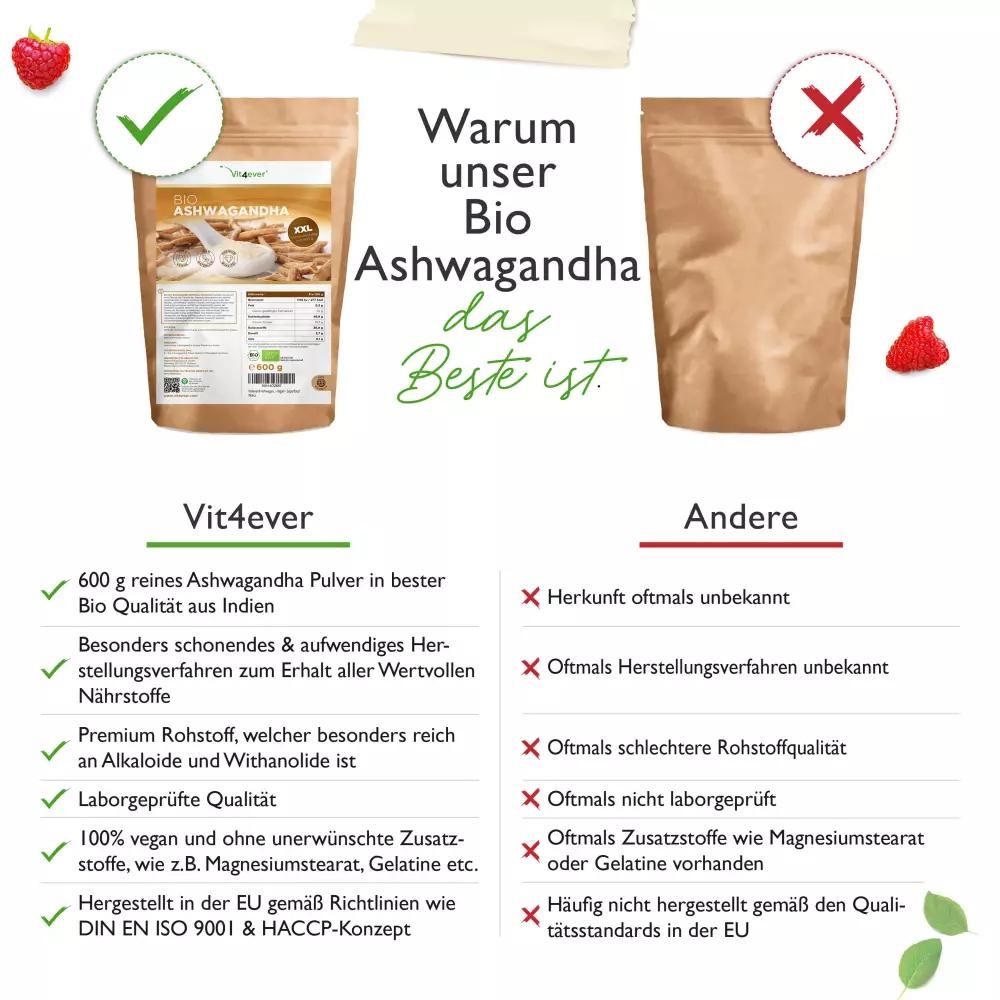 Ashwagandha: Die frische Beere mit jahrtausendealter TraditionIn der ayurvedischen Lehre blickt das Nachtschattengewächs Ashwagandha auf eine lange Tradition der Anwendung zurück. Aufgrund der wertvollen Inhaltsstoffe, die in der Alternativmedizin seit Jahrtausenden geschätzt werden, interessiert sich auch die klassische Schulmedizin zunehmend für Ashwagandha. Daher sind die Inhaltsstoffe der Withania somnifera – dem botanischen Namen der Winterkirsche – Mittelpunkt aktueller Studien und Forschungsarbeiten. Das macht das Ashwagandha-Pulver von Vit4ever so beliebtDas Angebot an Ashwagandha-Pulver wächst aufgrund des regelrechten Hypes um das Superfood zunehmend. Allerdings zeigt ein Blick auf das Etikett der einzelnen Supplemente, dass es große Qualitätsunterschiede gibt. Damit Du optimal von der Einnahme eines Ashwagandha-Pulvers profitieren kannst, muss sichergestellt werden, dass es sich um hochreine, streng kontrollierte Rohstoffe in Spitzenqualität – am besten aus ökologischem Anbau – handelt. Vorteile des Ashwagandha-Pulvers von Vit4ever: