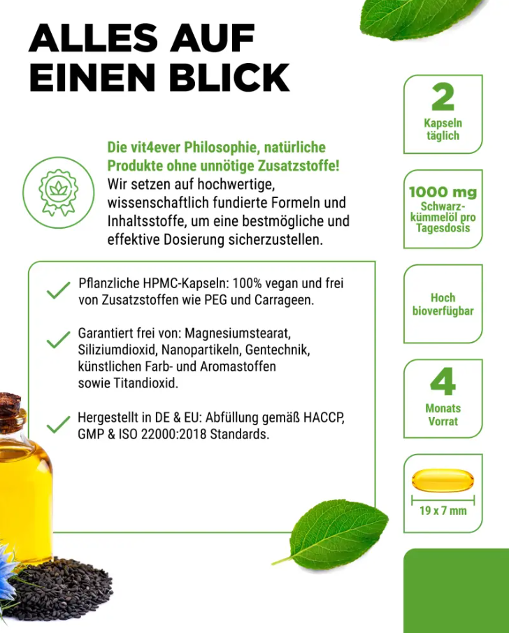 Bio-Schwarzkümmelöl (Nigella sativa), pflanzliche Kapselhülle: Hydroxypropylmethylcellulose. |