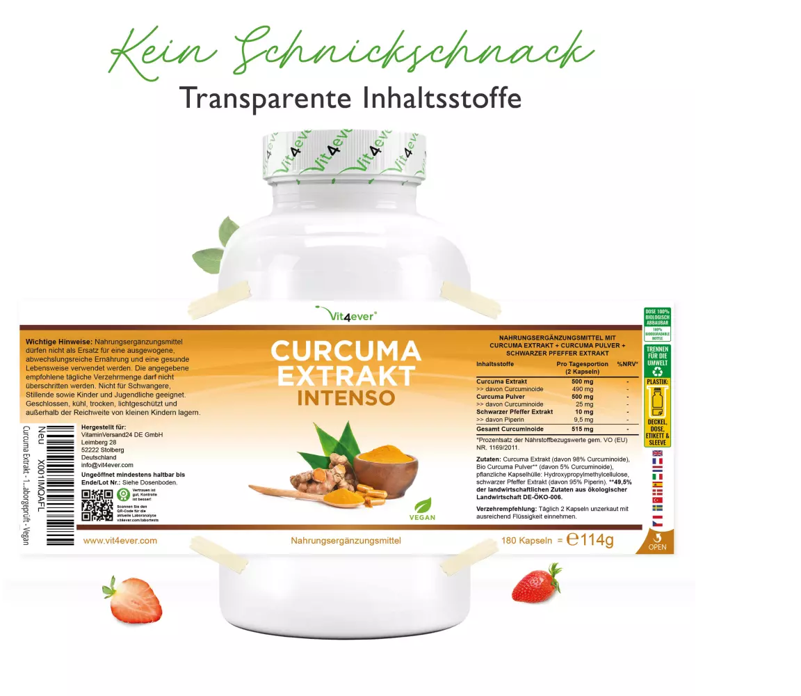 Jede Dose Kurkuma-Extrakt Intenso enthält 180 vegane und hochdosierte Kapseln, bestehend aus 500 mg Cucuma-Extrakt mit einem Curcuminoid-Gehalt von 490 mg, 500 mg Bio-Kurkuma-Pulver mit einem Curcuminoid-Gehalt von 25 mg und 10 mg Schwarzer-Pfeffer-Extrakt mit Piperin Inhalt von 9,5 mg pro Tagesportion von 2 Kapseln. Jede Dosis ist daher ausreichend für eine Anwendungsdauer von mindestens 3 Monaten / 90 Tagen. |