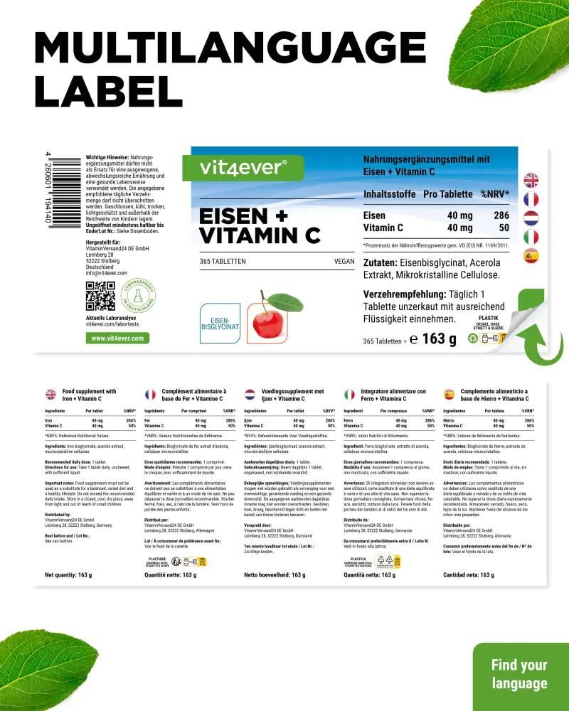 Vit4ever Eisen + Vitamin C - Eisenbisglycinat- 365 Tabletten