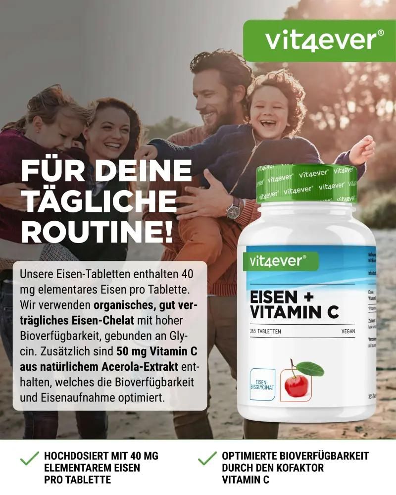 Vit4ever Eisen + Vitamin CEisen ist nicht nur eines der wichtigsten aber auch eines der häufigsten Spurenelemente in unserem Körper. Mineralstoffe und Spurenelemente sind generell wichtige Nähr,- und Vitalstoffe, jedoch erhält Eisen seine besondere Bedeutung aufgrund seiner Hauptfunktion, nämlich dem Transport von Sauerstoff, sowie auch dem Energiestoffwechsel. Eisen bindet nämlich den Sauerstoff an das Hämoglobin und sorgt somit für die Sauerstoffversorgung in unserem Blutkreislauf. Eine nicht ausreichende Aufnahme von Eisen über die Nahrung kann zu Eisenmangel führen, was nichts anderes bedeutet als das uns schlichtweg die Kraft ausgeht und uns die Energie ausgeht. Die unangenehmen Folgen von Eisenmangel können Müdigkeit, Kopfschmerzen, Schwächeanfälle, Atemnot, Konzentrationsschwäche und auch übermäßig trockene und rieselnde Haare sein. Nahrungsergänzungsmittel wie zum Bsp. Eisentabletten oder Eisen Kapseln können einem solchen Mangel entgegenwirken und körpereigene Stoffwechselprozesse unterstützen. Natürliches Eisen kann von unserem Körper am Besten in der Kombination mit Vitamin C aufgenommen werden. Das Vitamin ist ein Förderer der Eisenresorption und wandelt das Spurenelement von 3-wertigem zu 2-wertigem Eisen um, welches vom Körper schneller und besser aufgenommen werden kann. Wie wirken Eisen + Vitamin C?Wie bereits erwähnt nimmt das Spurenelement Eisen eine bedeutende Schlüsselfunktion für den Sauerstofftransport, als auch für den Energiestoffwechsel ein. Betrachtet man die Wirkung des Mikronährstoffes genau, trägt es zu einer normalen Bildung der roten Blutkörperchen und Hämoglobi bei. Weiterhin verringert Eisen Müdigkeit und trägt zu einer normalen kognitiven Funktion bei. Weitere wohltuende Wirkungen sind der Beitrag zu einer normalen Funktion des Immunsystems und der Zellteilung im Körper. Darüber hinaus ist Eisen sehr wichtig für die Entwicklung der Wahrnehmungsfähigkeit bei Kindern. Vitamin C trägt ebenfalls zu normalem Stoffwechsel bei, stärkt das Immunsystem, schützt Zellen vor oxidativem Stress und hat zudem positive Eigenschaften auf die Bildung von Haut, Knochen, Knorpel und Zähnen. Eisenchelat / Bisglycinat mit höchster Bioverfügbarkeit!Unter Eisenbisglycinat versteht man die Verbindung aus Eisen mit der synthetisch hergestellten Aminosäure L-Glycin. Diese Verbindung ist nicht nur gut verdaulich und für Veganer und Vegetarier bestens geeignet, sondern besitzt auch eine sehr hohe Resorptionsfähigkeit. Studien konnten aufzeigen das Eisenbisglycinat bis zu 59 % besser vom Körper aufgenommen wird als Eisensulfat und damit eine sehr hohe Bioverfügbarkeit aufweist, sowie dass es auch aufgenommen werden kann, wenn eisenblockierende Lebensmittel wie: Kaffee, Ballaststoffe oder Tee konsumiert werden. Optimiert mit natürlichen Vitamin C Abgerundet haben wir unser Eisen + Vitamin C Tabletten durch die Zugabe von natürlichen Vitamin C in Form von hochwertigen Acerola-Extrakt. Dies ermöglicht es uns nicht nur ein 100% veganes Eisen-Präparat bereitzustellen, sondern auch die Aufnahme durch den Co-Faktor: Vitamin C noch einmal zu steigern, da Vitamin C die Aufnahme über den Darmtrakt zusätzlich optimieren kann. Highlights auf einen Blick: