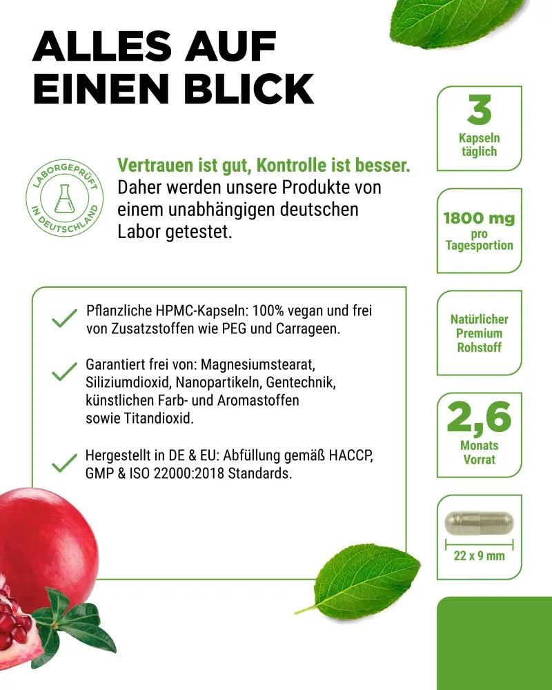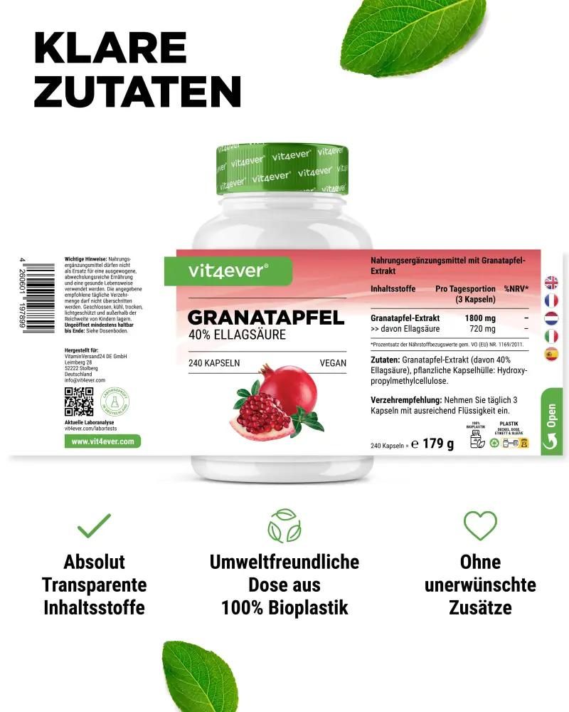 | Inhalt | Granatapfelextrakt (davon 40 % Ellagsäure), pflanzliche Kapselhülle: Hydroxypropylmethylcellulose. |