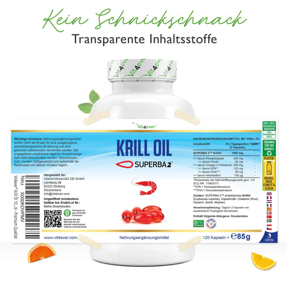 | Inhalt | SUPERBA 2 Antarktisches Krillöl (Euphausia superba), Kapselhülle (Gelatine (Rind), Glycerin, Sorbitol, Wasser). |