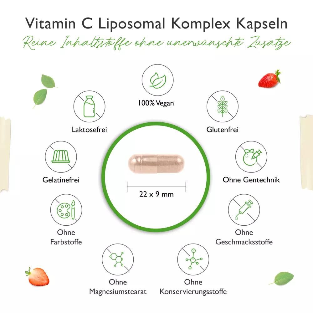 | Inhalt | Liposomale Vitamin C (L-Ascorbinsäure, Phospholipide (aus Sonnenblumen)), pflanzliche Kapselhülle: Hydroxypropylmethylcellulose, Hagebuttenextrakt 20:1, Ascorbylpalmitat. |