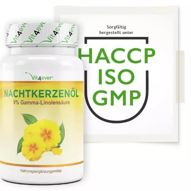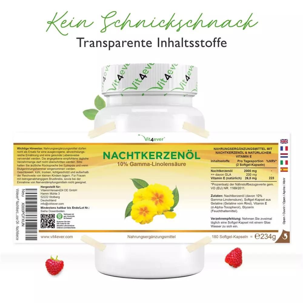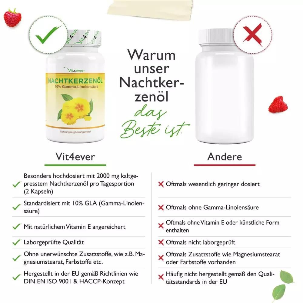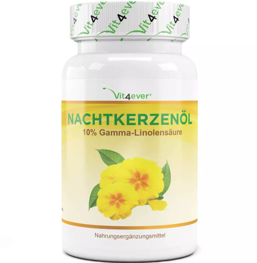 Vit4ever Nachtkerzenöl im DetailUnsere Nachtkerzenöl Kapseln sind besonders hochdosiert mit 2000 mg pro Tagesportion (Tagesportion = 2 Kapseln). Jede Kapsel enthält 1000 mg kaltgepresstes Nachtkerzenöl mit 10% Gamma-Linolensäure. Der GLA Anteil beträgt somit 200 mg bei einer Tagesportion von 2 Kapseln. Zusätzlich enthalten unsere Kapseln noch natürliches Vitamin E. Vitamin E gilt als starkes Antioxidans & schützt die empfindlichen Inhaltstoffe der Nachtkerze vor Oxidation und erhöht die Bioverwertbarkeit der einzelnen Inhaltstoffe. Gemäß Verzehrempfehlung wird die Einnahme von 2 Kapseln täglich empfohlen, somit reicht eine Dose mit 180 Softgel Kapseln für volle 90 Tage Anwendung. Vit4ever QualitätFür unsere Nachtkerzenöl Kapseln verwenden wir nur Premium Zutaten mit einer sehr hohen Reinheit. Unsere hochwertigen Nachtkerzenöl Kapseln sind natürlich frei von unerwünschten Zusatzstoffen.Die Softgelkapseln sind frei von Magnesiumstearat, Aromen, Farbstoffen und selbstverständlich auch GMO-frei, laktosefrei und glutenfrei. Zusätzlich wurden unsere Nachtkerzenöl Kapseln unabhängig laborgeprüft auf Schwermetalle, Schimmelpilze, E. Coli, Salmonellen & weitere relevante Prüfkriterien. Die Untersuchung wurde von einem nach DIN EN ISO/IEC 17025 zertifizierten, unabhängigen deutschen Labor durchgeführt. Das Analysezertifikat dazu können Sie den Produktbildern entnehmen. |