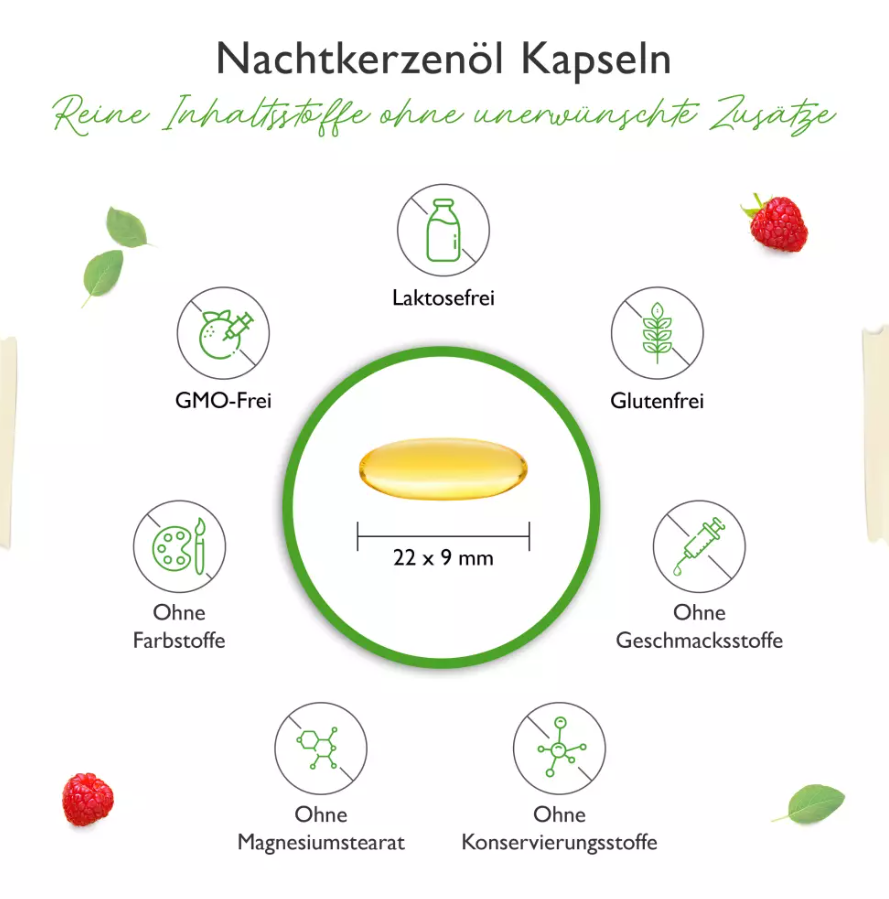 Nahrungsergänzungsmittel (NEM) mit Nachtkerzenöl & natürlichem Vitamin E. Dieses Produkt ist kein Arzneimittel. |