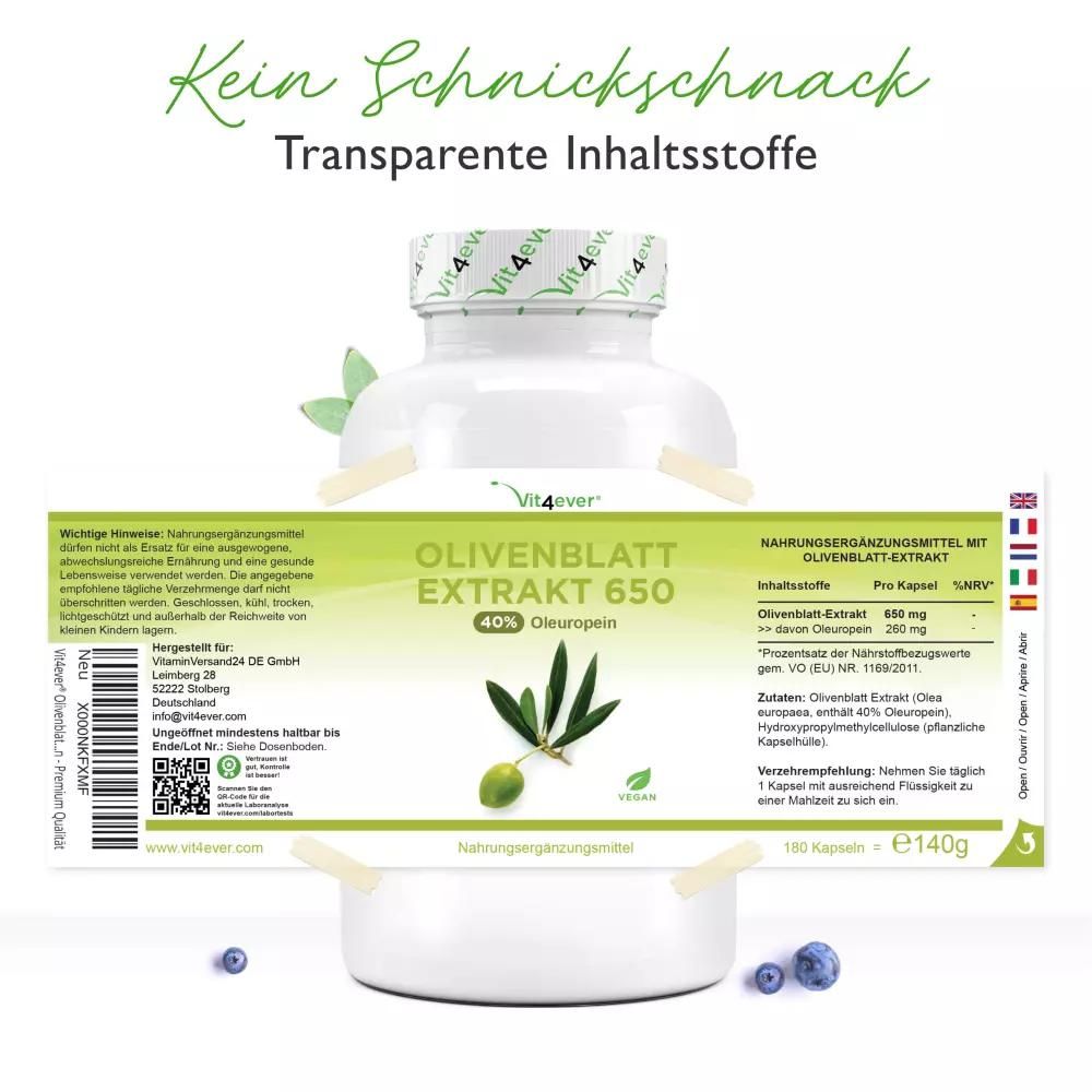 Vit4ever Olivenblatt Extrakt 650 - 650 mg - 40% Oleuropein - 180 Kapseln
