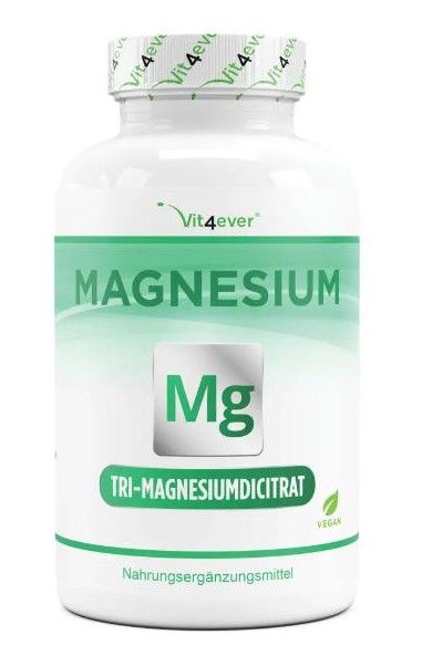 Tri-MagnesiumdicitratTri-Magnesiumdicitrat ist eine organische Magnesium-Verbindung, bei der das Magnesium an die Zitronensäure gebunden ist. Die Zitronensäure ist jedoch ein Bestandteil des menschlichen Organismus und kann somit das Magnesium nicht nur optimal und sehr verträglich aufnehmen, sondern sorgt zudem auch für ein basisches „Umfeld“. Somit enthalten Vit4ever Tri-Magnesiumdicitrat Kapseln eine sehr hochwertige Magnesiumverbindung mit einer sehr hohen Magnesiumkonzentration, welche der Körper schnell und effizient aufnehmen kann. Ein weiterer Vorteil ist die, wie bereits angedeutet, basische „Reaktion“; Tri-Magnesiumdicitrat wird dem Organismus zugefügt -> reagiert basisch -> und wird sogar wieder basisch ausgeschieden! Es entsteht keine toxische Reaktion im Körper. Somit empfehlen sich Vit4ever Tri-Magnesiumdicitrat Kapseln für alle Menschen, die im Alltag oder bei sportlichen Aktivitäten einen Magnesium-Mangel schnell ausgleichen möchten. Highlights auf einen Blick: