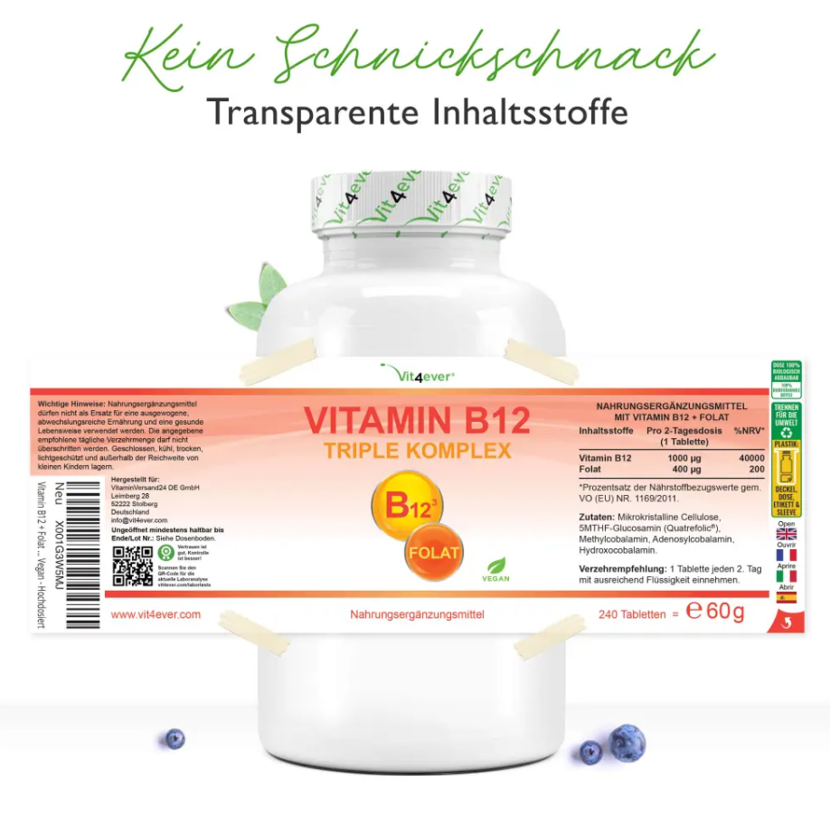 Vit4ever Vitamin B12 Triple Komplex 240 Tabletten Folat 5-MTHF Quatrefolic