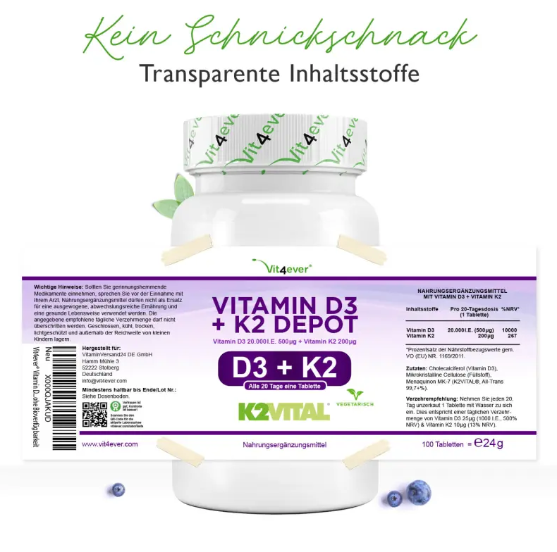 | Inhalt | Cholecalciferol (Vitamin D3), Mikrokristalline Cellulose (Füllstoff), Menaquinon MK-7 (K2VITAL, All-trans 99+%). |