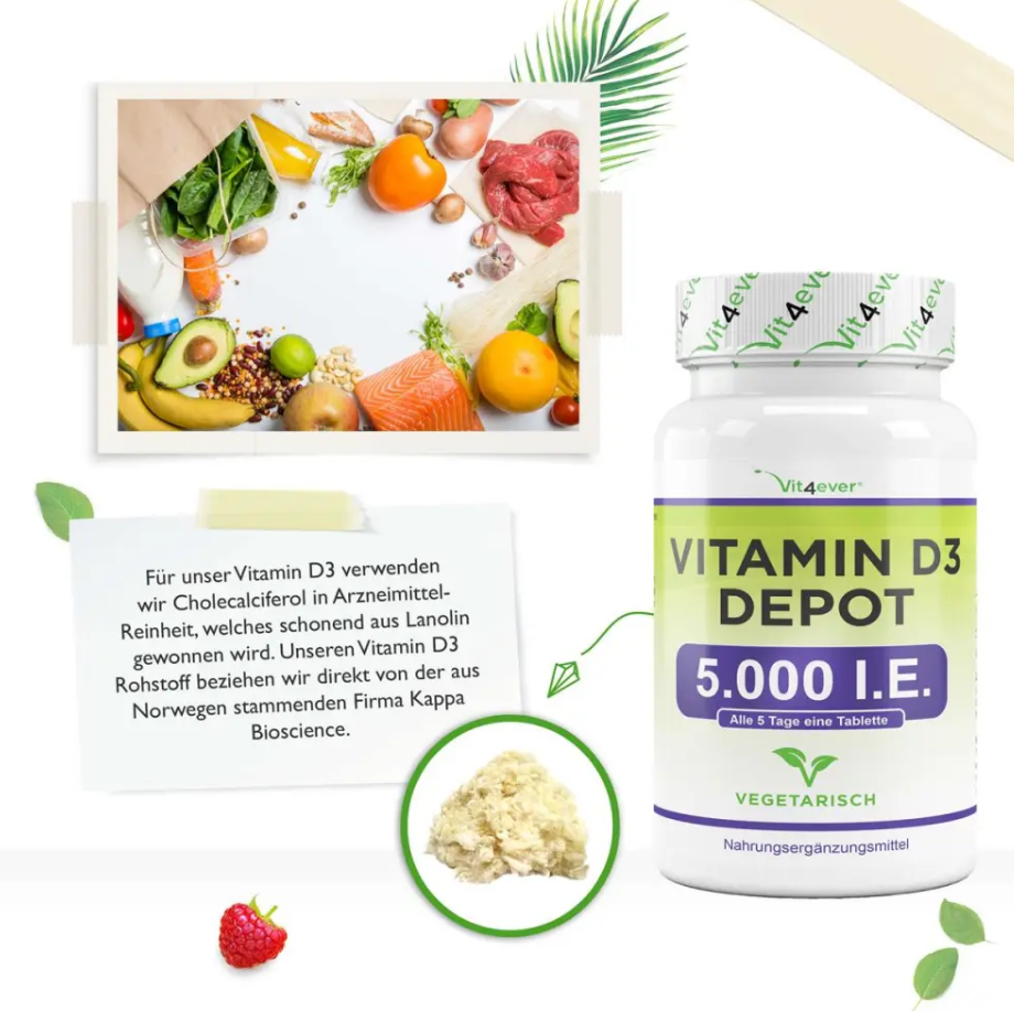 Vit4ever Vitamin D3 Depot 5.000 IE im DetailUnsere Vitamin D3 Tabletten werden nach europäischen Qualitätsstandards (DIN EN ISO 9001 und HACCP-Konzept) hergestellt und wie bei allen Vit4ever Nahrungsergänzungsmitteln legen wir stets großen Wert darauf, dass bei der Herstellung nur natürliche Premium-Rohstoffe verwendet werden. Unser Vitamin D3 wird schonend und natürlich aus Lanolin (Wollfett) gewonnen. Lanolin hat eine besonders hohe Bioverfügbarkeit und eine sehr hohe Stabilität. |
