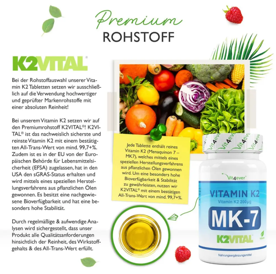 Vit4ever Vitamin K2 im DetailBei der Auswahl der Rohstoffe für unsere Vitamin K2 Tabletten setzen wir ausschließlich auf die Verwendung hochwertiger und geprüfter Markenrohstoffe mit absoluter Reinheit! Für unser Vitamin K2 setzen wir auf den Premium-Rohstoff K2VITAL! K2VITAL ist nachweislich das sicherste und reinste Vitamin K2 mit einem bestätigten all-trans-Gehalt von mindestens 99,7+%. Es ist zudem in der EU von der Europäischen Behörde für Lebensmittelsicherheit (EFSA) zugelassen, hat in den USA den GRAS-Status erhalten und wird durch ein spezielles Herstellungsverfahren aus pflanzlichen Ölen gewonnen. Es hat eine nachgewiesene Bioverfügbarkeit und eine besonders hohe Stabilität. |