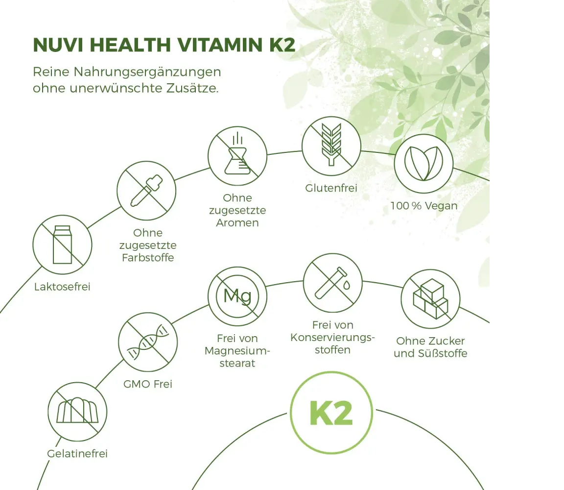 Vitamin K2 Tropfen von Nuvi Health sind absolut reine Tropfen mit optimaler Wirksamkeit, hergestellt aus den besten Zutaten. Vitamin K ist ein fettlösliches Vitamin, das nur in Verbindung mit einer Fett-/Ölquelle optimal vom Körper aufgenommen werden kann. Deshalb verwenden wir bei Nuvi Health als Trägerstoff für unsere K2-Tropfen ausschließlich hochwertiges Kokosöl MCT (mittelkettige Triglyceride) in pharmazeutischer Qualität (ph. Eur.), da der Wirkstoff die höchste Bioverfügbarkeit hat und verwertet werden kann vom Körper am schnellsten. Die Tropfen sind 100% frei von schädlichen Zusatzstoffen, enthalten keine Allergene und müssen nicht wie Tabletten oder Kapseln abgebaut werden. Es ist auch einfacher zu verwenden für Menschen, die es vorziehen, Tabletten oder Kapseln zu vermeiden.