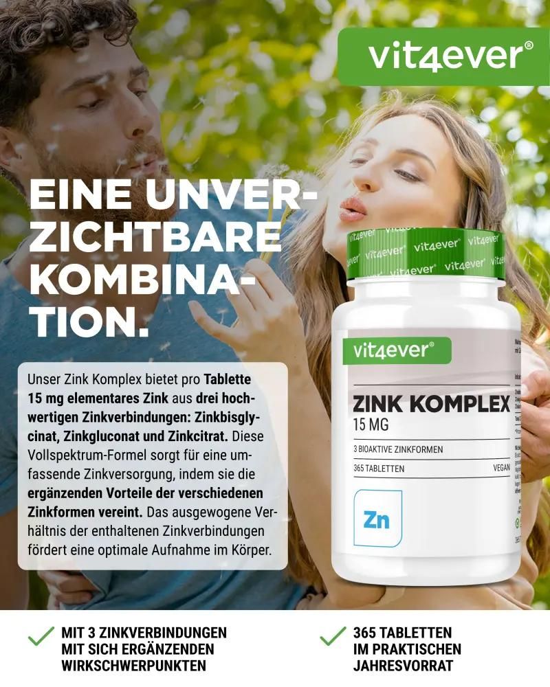 Vit4ever Zink Komplex – Deine tägliche Unterstützung für Gesundheit und SchönheitWarum Zink essenziell istZink ist ein unverzichtbarer Nährstoff, der vom Körper nicht selbst produziert werden kann. Es trägt zur Erhaltung normaler Haut, Haare und Nägel bei, unterstützt das Immunsystem und spielt eine Rolle bei der Zellteilung. Die 15 mg Variante des Vit4ever Zink Komplexes bietet eine moderate Dosierung, die ideal für den täglichen Bedarf geeignet ist. Die 15 mg VarianteUnsere 15 mg Variante liefert 15 mg elementares Zink pro Tablette aus drei bioaktiven Zinkverbindungen: Zinkbisglycinat, Zinkgluconat und Zinkcitrat. Diese ausgewogene Zinkzufuhr ist perfekt für alle, die ihren täglichen Bedarf abdecken möchten, ohne dabei überzudosieren. Wichtige Vorteile von Zink: