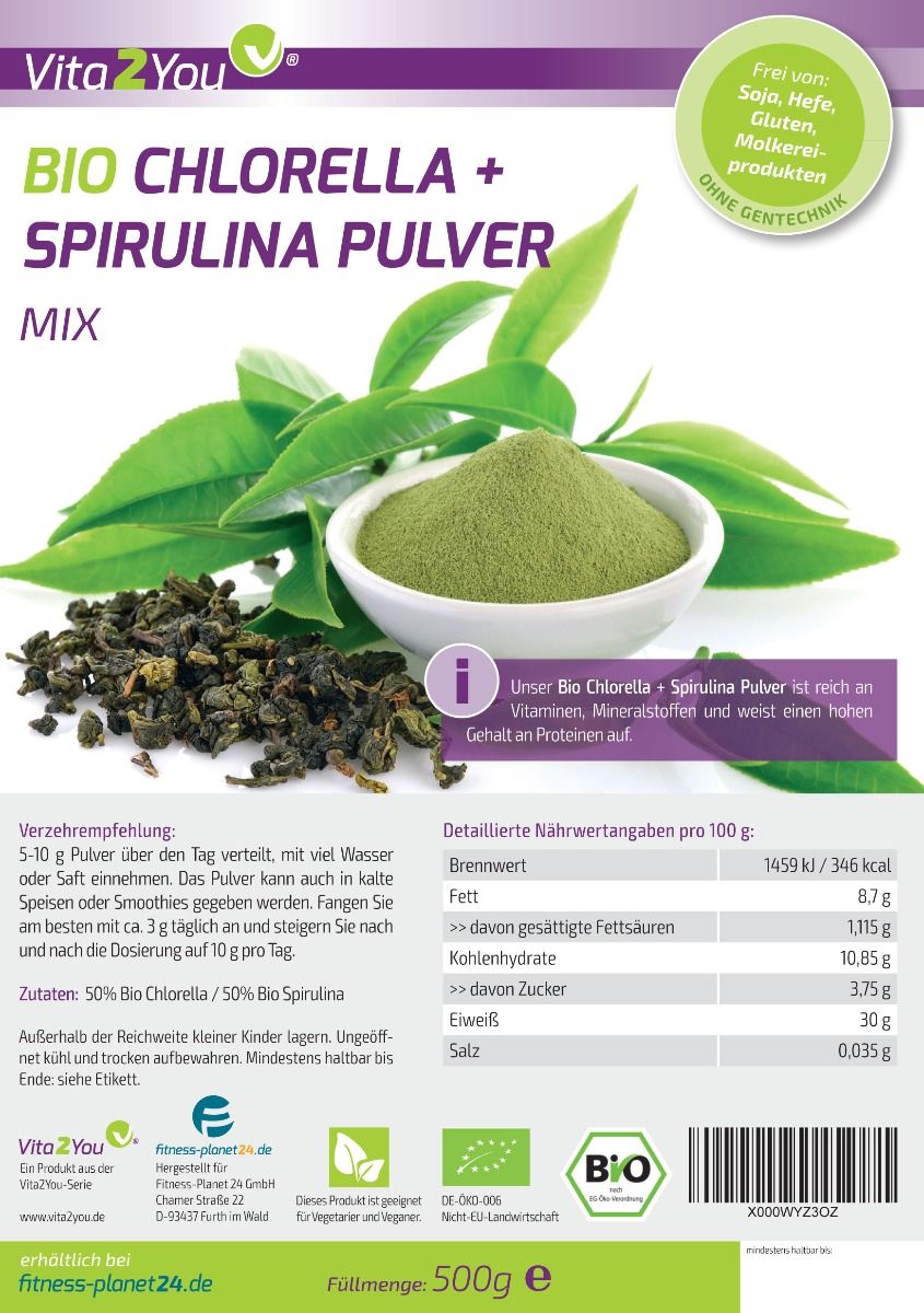 Vita2You Bio Chlorella + Spirulina Mix Pulver 500g 50:50 Mix