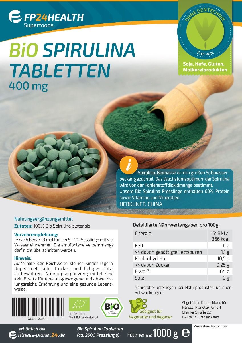 FP24 Health Bio Spirulina Tabletten 400mg - 1kg - Platensis Algen 1000g