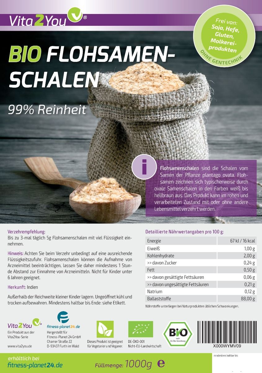 | Beschreibung | Was ist der Unterschied zwischen Flohsamen und Flohsamenschalen? Flohsamen enthalten den gesamten Samen, einschließlich der Schale und der darin enthaltenen nahrhaften Samen. Flohsamenschalen bestehen dagegen nur aus der transparenten / weißlichen Schale, die den Kern/Samen umgibt, und bestehen fast ausschließlich aus Fasern (85-90% m Fasern). Die schalen machen ungefähr 27% aus vom gesammten Samen. Es ist wichtig zu beachten, dass der Gelierungseffekt nur von der Schale selbst kommt. Die meisten Fasern in Flohsamenschalen bestehen aus Arabinoxylan, das auch die physiologisch aktive Komponente ist. Flohsamenschalen können mehr als das 40-fache ihres Eigengewichts an Wasser binden. Die Fasern haben einen volumenbildenden Effekt, der den Stuhlgang stimuliert und die Durchgangszeit durch den Darm verkürzt. Die wasserbindenden Fasern machen loses Stuhl fäster und erweichert harten Stuhl. Pflanzenschleim in den Flohsamenschalen wirkt schmierend und beruhigend auf den Darm. Flohsamen kann bei Verstopfung, Durchfall, Reizdarm, Hämorrhoiden, Divertikel, Cholesterinregulierung und Glutenfreies Backen verwendet werden. Flohsamen sollen außerdem das Wachstum darmfreundlicher Bakterien fördern. Tolles Preis-Leistungsverhältnis, enthält keine Allergene und für Vegetarier und Veganer geeignet. |