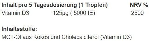 | Verwendung | Jeden 5. Tag 1 Tropfen mit einem Glas Wasser einnehmen. Dies entspricht einer täglichen Verzehrmenge von 25 μg (1000 I.E., 500% NRV). Die empfohlene Verzehrmenge darf nicht überschritten werden. |