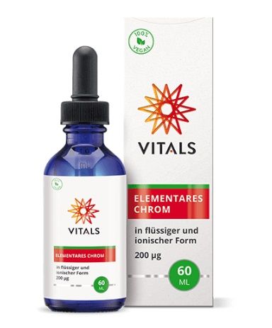 Chrom trägt zur Aufrechterhaltung eines normalen Blutzuckerspiegels bei und ist wichtig für den Kohlenhydrat-, Eiweiß- und Fettstoffwechsel, da es die Insulinwirkung unterstützt. Insulin wird in der Bauchspeicheldrüse produziert und in den Blutkreislauf abgegeben, wenn die Gefahr besteht, dass der Blutzuckerspiegel zu hoch steigt, z. B. nach dem Verzehr von Kohlenhydraten. Es öffnet die insulinempfindlichen Zellen (Muskel-, Leber- und Fettzellen) für Glukose, indem es an Insulinrezeptoren bindet. Insulinempfindliche Gewebe speichern überschüssige Glukose zur späteren Verwendung in Form von Glykogen und (insbesondere) Fetten. Im Idealfall sollte der Blutzuckerspiegel nur wenig schwanken und die Insulinabgabe nicht höher sein als unbedingt nötig. Nahrung, die reich an einfachen Zuckern ist, erhöht die Ausscheidung von Chrom.Inhalt Gereinigtes Wasser, Meerwasserkonzentrat (CMD), Säuerungsmittel (Zitronensäure), Chromchlorid, Konservierungsstoff (Kaliumbenzoat [<0,1 %]). Verwendung Nehmen Sie mit dem Opti-Dose-Tropfer 1 ml pro Tag ein. Geben Sie die Tropfen in (ca. 200 ml) Wasser, Fruchtsaft oder Nahrung. Vor Gebrauch schütteln. Die angegebene empfohlene tägliche Verzehrsmenge darf nicht überschritten werden. Es kann eine leichte Kristallisation auftreten, die jedoch die Qualität des Produkts nicht beeinträchtigt.Garantie Für Vegetarier und Veganer geeignet. Warnhinweise Konsultieren Sie vor der Einnahme von Nahrungsergänzungsmitteln im Falle von Schwangerschaft, Stillzeit, Medikamenteneinnahme und Krankheit einen Arzt, Apotheker oder Heilpraktiker.Lagerhinweise Bitte kühl und trocken lagern. Hergestellt VITALS (Niederlande)