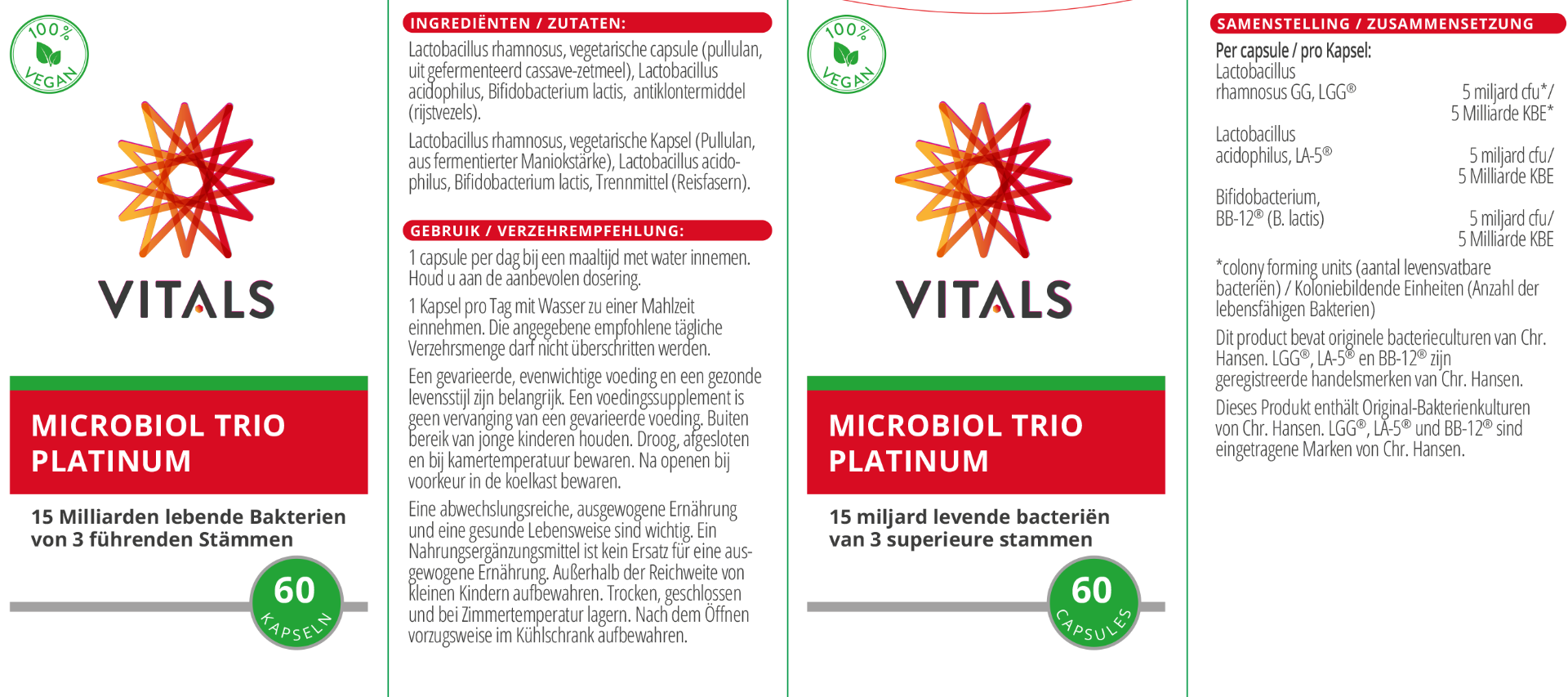 Die Haltbarkeit dieses Produkts beträgt maximal 15 Monate ab Lieferung. Dieses Produkt kombiniert die bekannten Stämme Lactobacillus acidophilus, LA-5, Bifidobacterium lactis, BB-12, Lactobacillus rhamnosus sowie GG, der mit Abstand bekannteste Stamm. So entstand ein hervorragendes Trio. Microbiol Trio Platinum enthält 15 Milliarden CFU (koloniebildende Einheiten oder die Anzahl lebensfähiger Bakterien, die sich vermehren und eine Kolonie bilden können). Auch als Microbiol Trio Basis mit 3 Milliarden KBE erhältlich. Hersteller Chr. Hans |