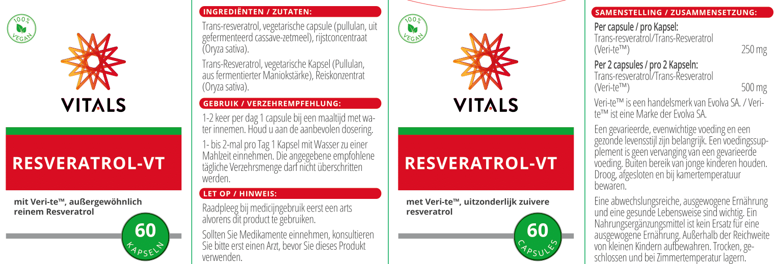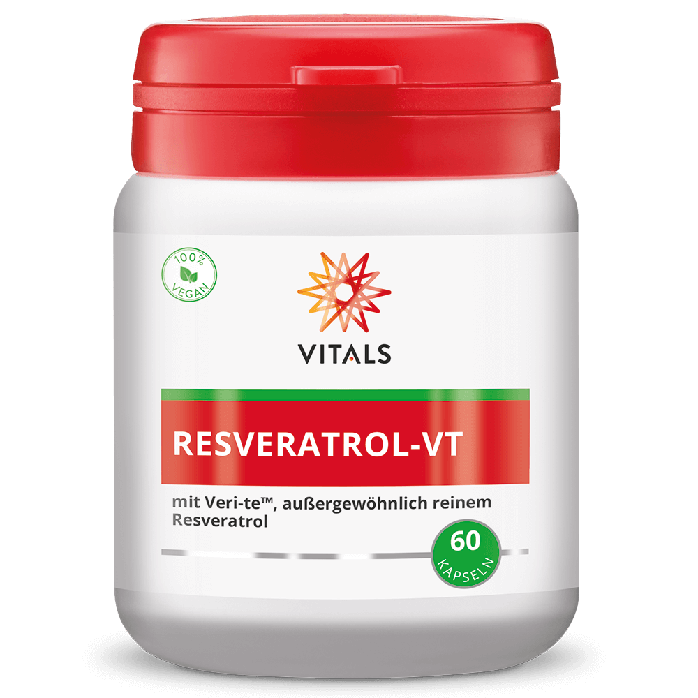 Resveratrol ist ein bekannter Nährstoff, der unter anderem in Trauben (Rotwein) und amerikanischen Blaubeeren vorkommt. Resveratrol schützt die Pflanze vor äußeren Einflüssen und unterstützt sie bei schlechten Wachstumsbedingungen. Das wissenschaftliche Interesse an Resveratrol ist groß. Zu diesem Thema wurden etwa 8000 wissenschaftliche Arbeiten veröffentlicht, darunter mehr als 200 Humanstudien. Die Hauptwirkung von Resveratrol besteht darin, die Gesundheit von Herz und Blutgefäßen zu unterstützen. Resveratrol tut dies auf verschiedene Weise, eine davon ist, dass es zu einer guten Durchblutung beiträgt. Darüber hinaus ist Resveratrol ein starkes Antioxidans. Resveratrol-VT von Vitals enthält hochreines Resveratrol in der trans-Form (der biologisch aktiven Form, im Gegensatz zur praktisch wirkungslosen cis-Form). |