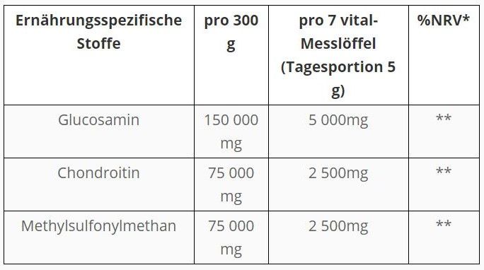 | Verwendung | 2,4 g Pulver (entspricht 1,2 g Glucosamin, 0,6 g Chondroitin, 0,6 g MSM) oder trinken 2 Vital-Messlöffel (beiliegend) einmal täglich mit Wasser oder Saft gemischt. |