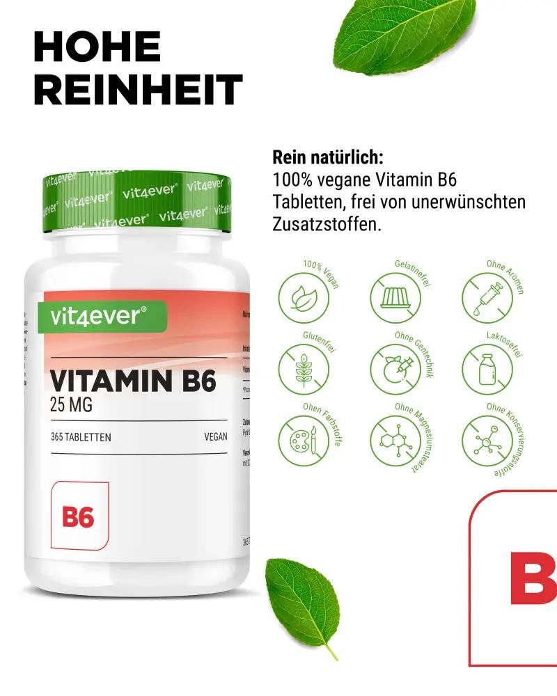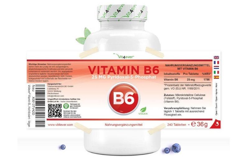 Lebensmittel mit einem hohen Vitamin B6 GehaltVitamin B6 kommt vor allem in Fleisch, Geflügel, Wild, Rind und Schwein, sowie in Fisch: Lachs, Makrele, Sardine, Getreide und Getreideprodukte: Weizenkeime, Wildreis. Gemüse: Kartoffeln, Hülsenfrüchte, grünes Blattgemüse vor. Hochdosiert aber nicht überdosiert!Wir von Vit4ever stellen Ihnen je Tablette einen hochdosierten Wirkstoffgehalt von 25 mg zur Verfügung, welcher einen Tagesbedarf von 1786% entspricht. Die sichere tägliche Höchstmenge für Vitamin B6 liegt bei 25 mg. Die sichere tägliche Höchstmenge für Vitamin B6 entspricht dem ca. 18-fachen der empfohlenen Tagesdosis der EU (Nutrient Reference Value, NRV). Dieser Wert gilt für erwachsene Männer und Frauen, sowie für Schwangere und Stillende! Laut dem digitalen Portal "Gesundheit" liegt eine chronische Überdosierung erst dann vor, wenn die tägliche Einnahme von B6 die Grenze von 500 Milligramm übersteigt. Im Hinblick auf diesen Hintergrund, können wir von Vit4ever Ihnen mit ruhigem Gewissen ein hoch dosiertes und 100% veganes Vitamin B6 Präparat liefern, welches hochdosiert, aber nicht überdosiert ist! Vitamin B6 wird meist in den Formen Pyridoxal, Pyridoxamin & Pyridoxin verwendet. Hier ist allerdings der große Nachteil das diese Vitamin B6-Formen erst noch vom Körper durch diverse biologische Vorgänge aktiviert bzw. umgewandelt werden müssen und somit nicht direkt zur Verfügung stehen. Aus diesem Grund haben wir von Vit4ever uns für die direkt wirksame und am besten bioverfügbare Variante das Pyridoxal-5-phosphat oder auch P-5-P entschieden. Pyridoxal-5-phosphat ist die bereits vom Körper umgewandelte Vitamin B6 Version und wird somit direkt in den Stoffwechsel gebracht. Man spricht hier auch von einem Vitamin B6 Coenzym. Auszug der zugelassenen wirkstoffbezogenen Aussagen zu Vitamin B6*, welche von der Europäischen Behörde für Lebensmittelsicherheit (EFSA) bestätigt wurden: