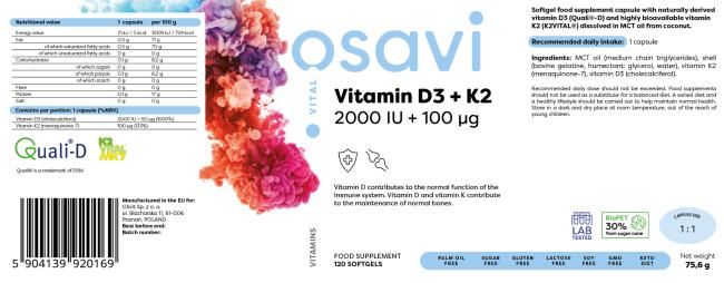 Osavi Vitamin D3 + K2 - 2000IU - 120 softgels