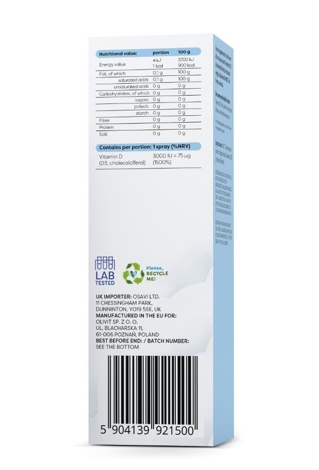 Food supplement with vitamin D3 (cholecalciferol) in the form of oral spray.