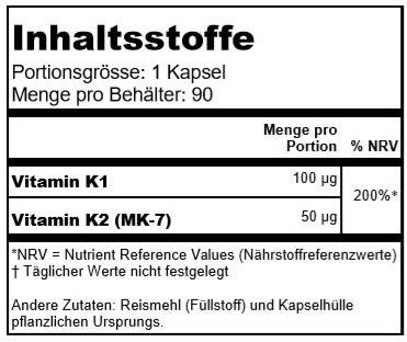 | Beschreibung | Vitamin K zählt zu den fettlöslichen Mikronährstoffen und besteht aus natürlich vorkommende Formen von Vitamin K, nämlich Vitamin K1 (Phyllochinon) und K2 (Menachinon). Vitamin K1 kommt hauptsächlich in Blättern vor, weil Vitamin K2 ausschließlich von Mikroorganismen im Darm gebildet wird ● Vitamin K Ist wichtig für die normale Erhaltung von Knochen ● Trägt zu einer normalen Blutgerinnung bei ● Vitamin K ist notwendig für Proteinbildung in Nieren |