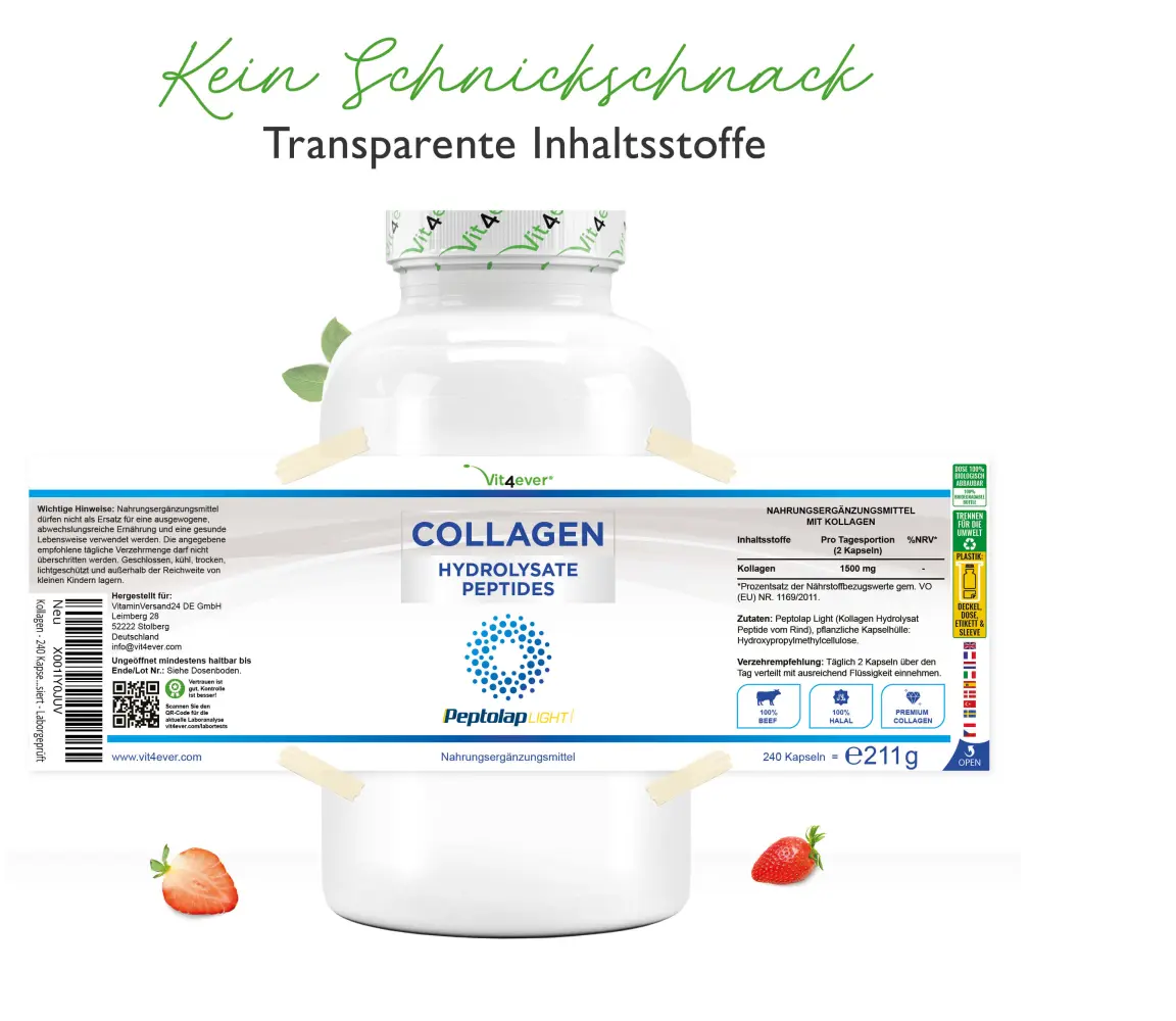 | Inhalt | Peptolap Light (Kollagenhydrolysat-Peptide vom Rind), pflanzliche Kapselhülle: Hydroxypropylmethylcellulose. |